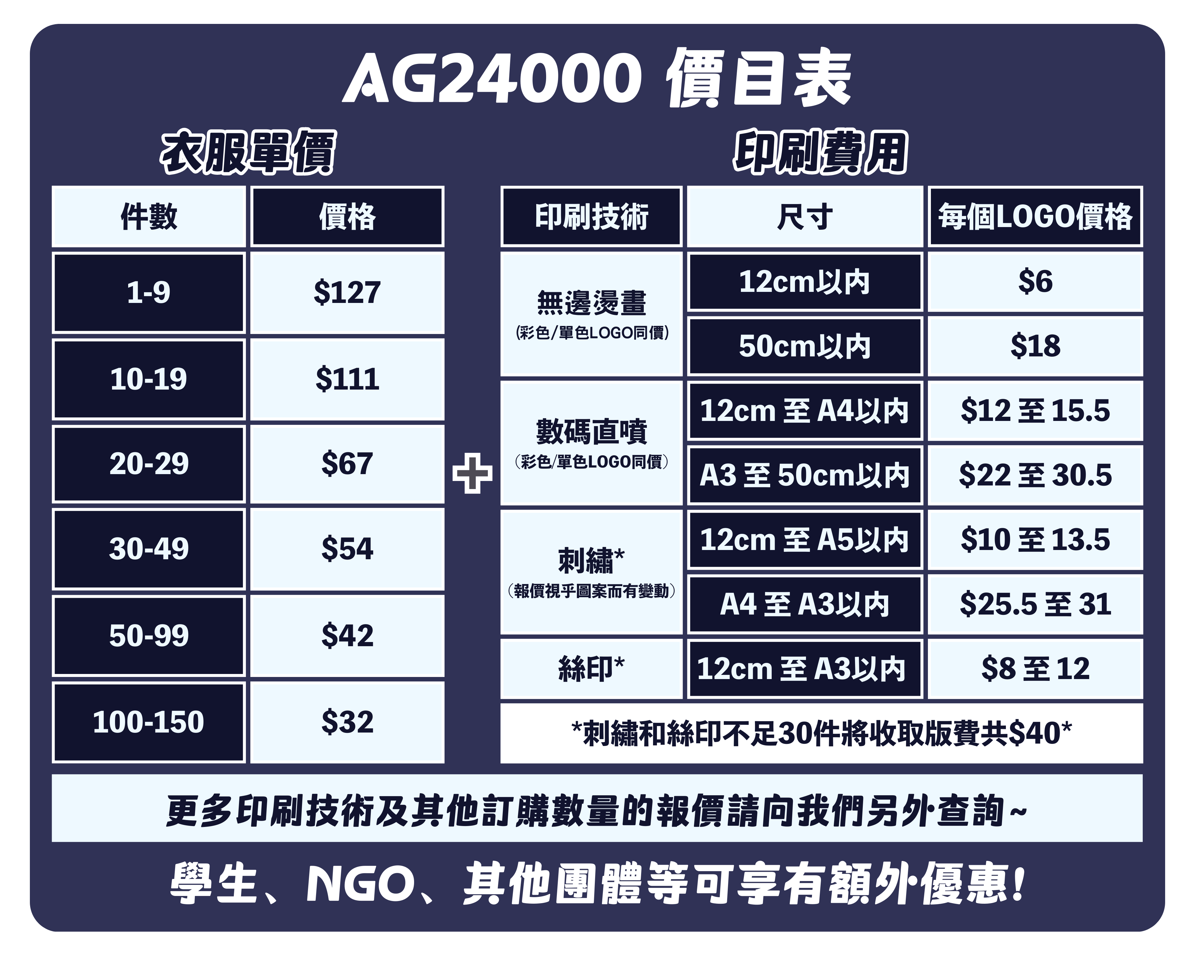 客人可以先參考每款產品網站的價目表,單價+印刷費用=成品價錢,學生、公司、NGO非牟利機構可享額外折扣優惠。最終報價以Whatsapp或Quotation為準。