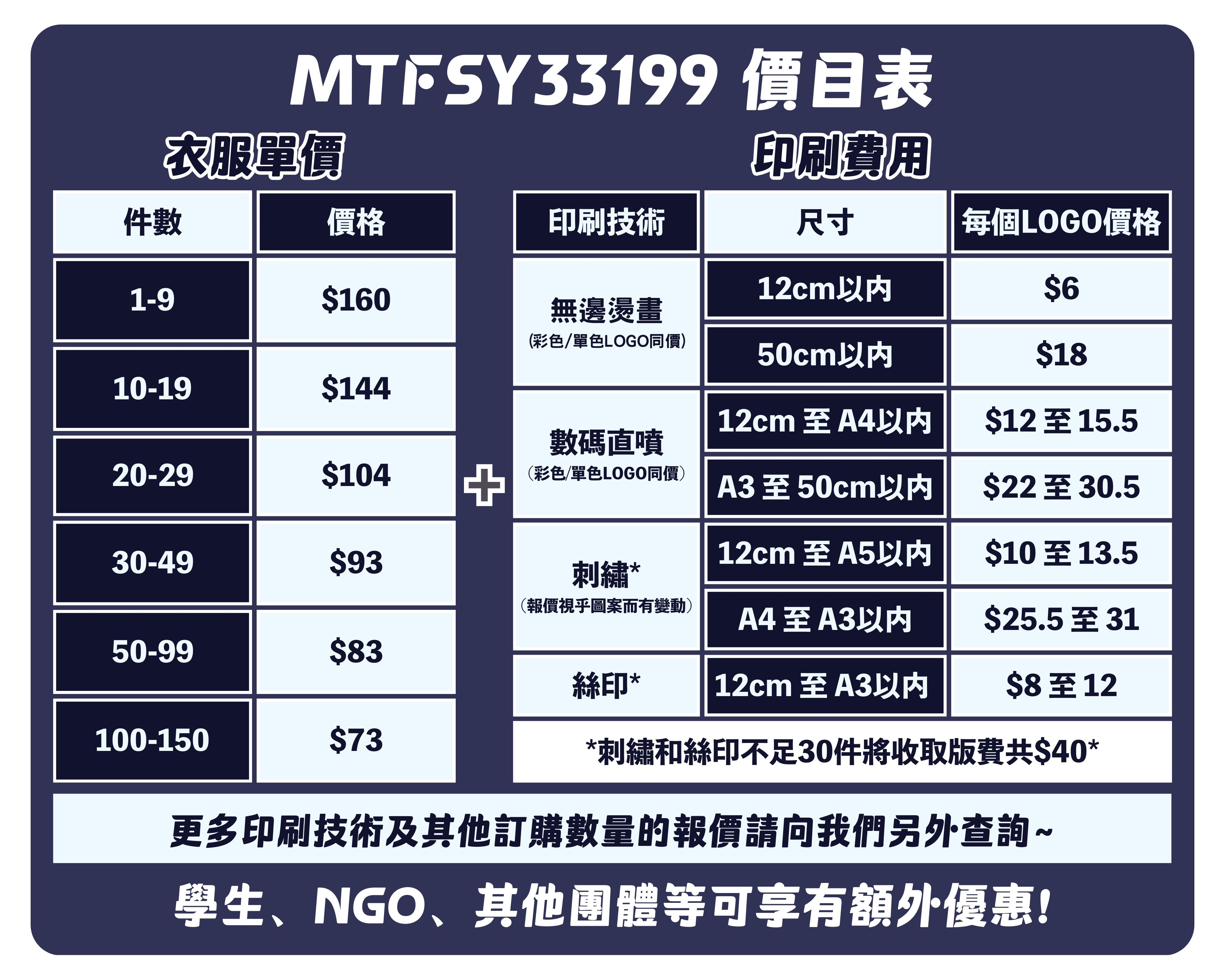 客人可以先參考每款產品網站的價目表,單價+印刷費用=成品價錢,學生、公司、NGO非牟利機構可享額外折扣優惠。最終報價以Whatsapp或Quotation為準。