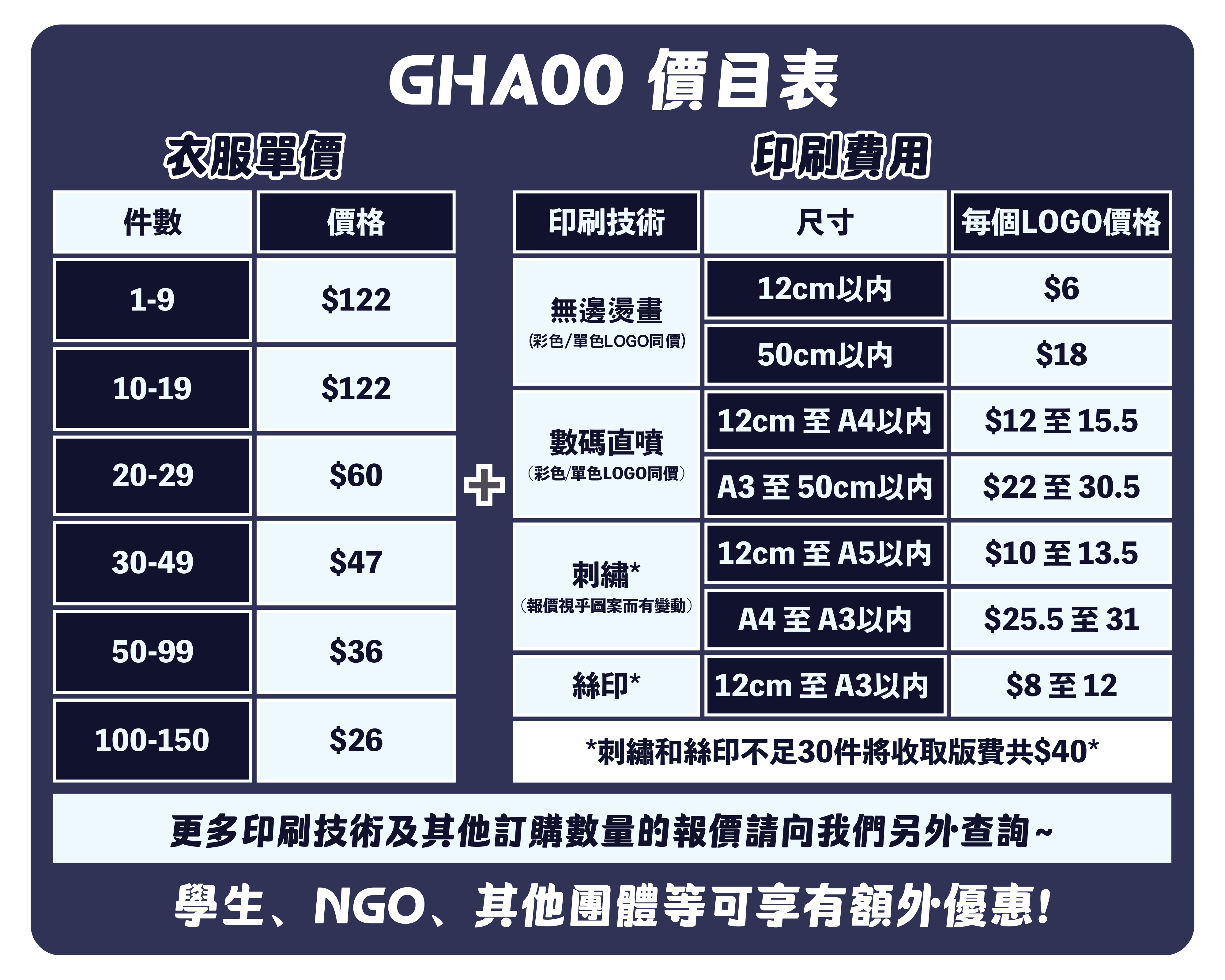 客人可以先參考每款產品網站的價目表,單價+印刷費用=成品價錢,學生、公司、NGO非牟利機構可享額外折扣優惠。最終報價以Whatsapp或Quotation為準。